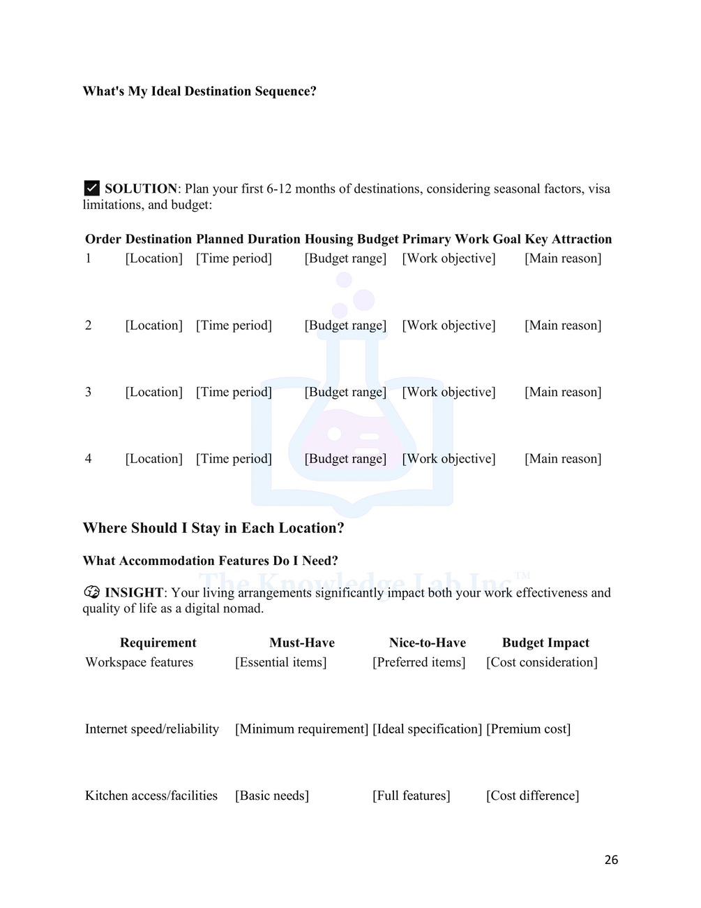- Remote Readiness Audit, Destination Matrix, Budget + Buffer