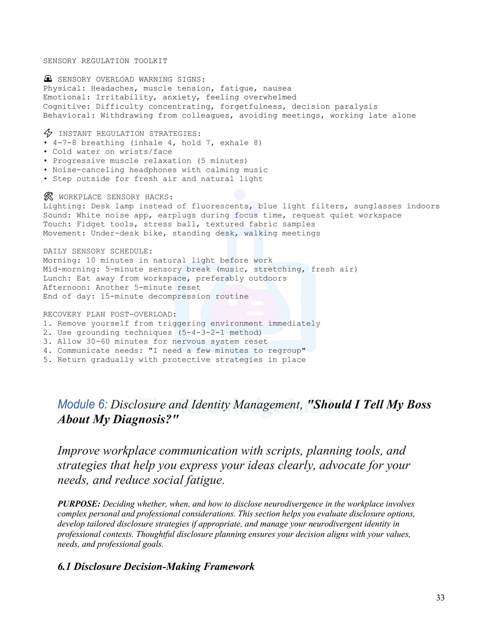 - Use an executive-function “emergency kit” and a sensory toolkit at work